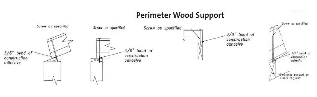 All perimeters and transition areas using Tectum composite planks need to be fully supported. Perimeter conditions, as well as hips, valleys, and ridges, must have the appropriate structural support in accordance with your approved contract documents. Where changes in slope do not exceed ½ inch in 12 inches in either direction, the long edge of the panel may be installed across the transition. When panel orientation is perpendicular to a change in slope, continuous support is required.