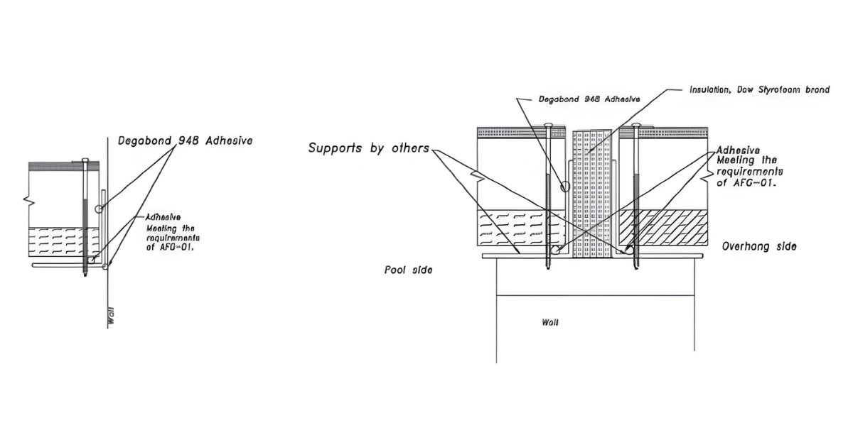 Because Tectum IIIP is designed for high-humidity areas, the differences between these and Tectum III are the panel perimeter details in the graphics to the right. While similar in overall construction to Tectum III panels, Tectum IIIP panels incorporate modified perimeter details, and these panels include perimeter slots that need to be filled with an insulated key joint and sealed with a continuous bead of construction adhesive. At building perimeters where panels terminate at walls, insulation beyond the panel edge is still required in accordance with the approved design. Panels shall also be properly insulated at openings and sealed at ridge conditions to support effective thermal and moisture performance.